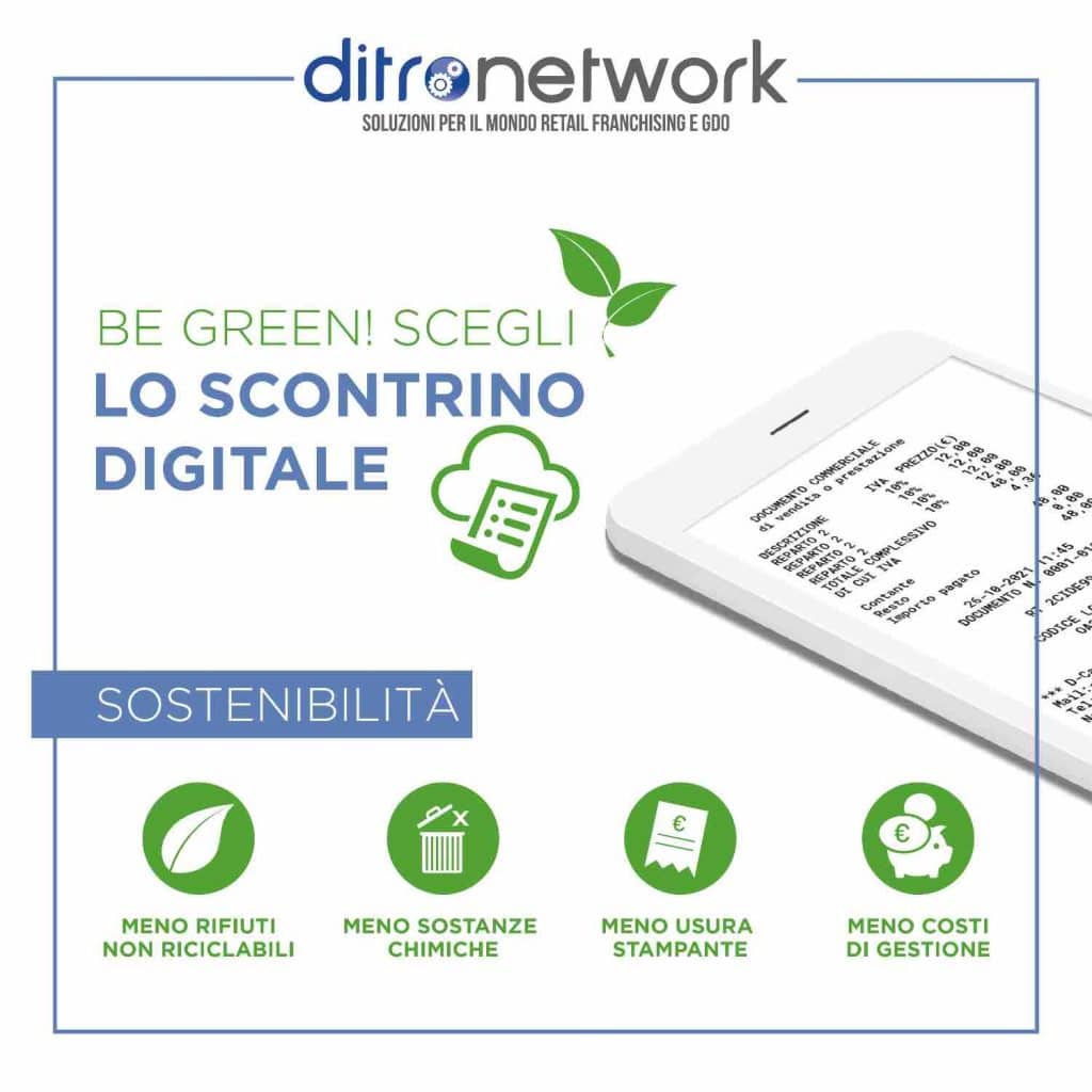 Lo scontrino digitale è la funzionalità omologata su tutti i registratori di cassa telematici Ditronetwork che equipara lo scontrino cartaceo a quello digitale garantendo la sua validità a norma di legge e consentendo così la non stampa dello stesso (esempio l’utilizzo per tessera sanitaria e/o garanzia sui prodotti elettronici).