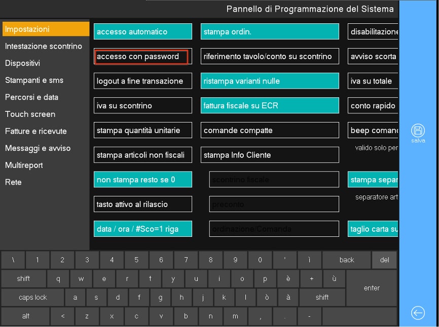 Apponendo il segno di spunta su Accesso con password il sistema, al successivo riavvio, permetterà il login Operatore solo dopo che quest’ultimo avrà digitato la propria password, oltre all’ID utente. Per salvare qualsiasi cambiamento apportato è sempre necessario premere il tasto Salva e seguire le indicazioni riportate nella finestra di conferma (suggerisce di riavviare il sistema al fine di confermare le modifiche apportate).
